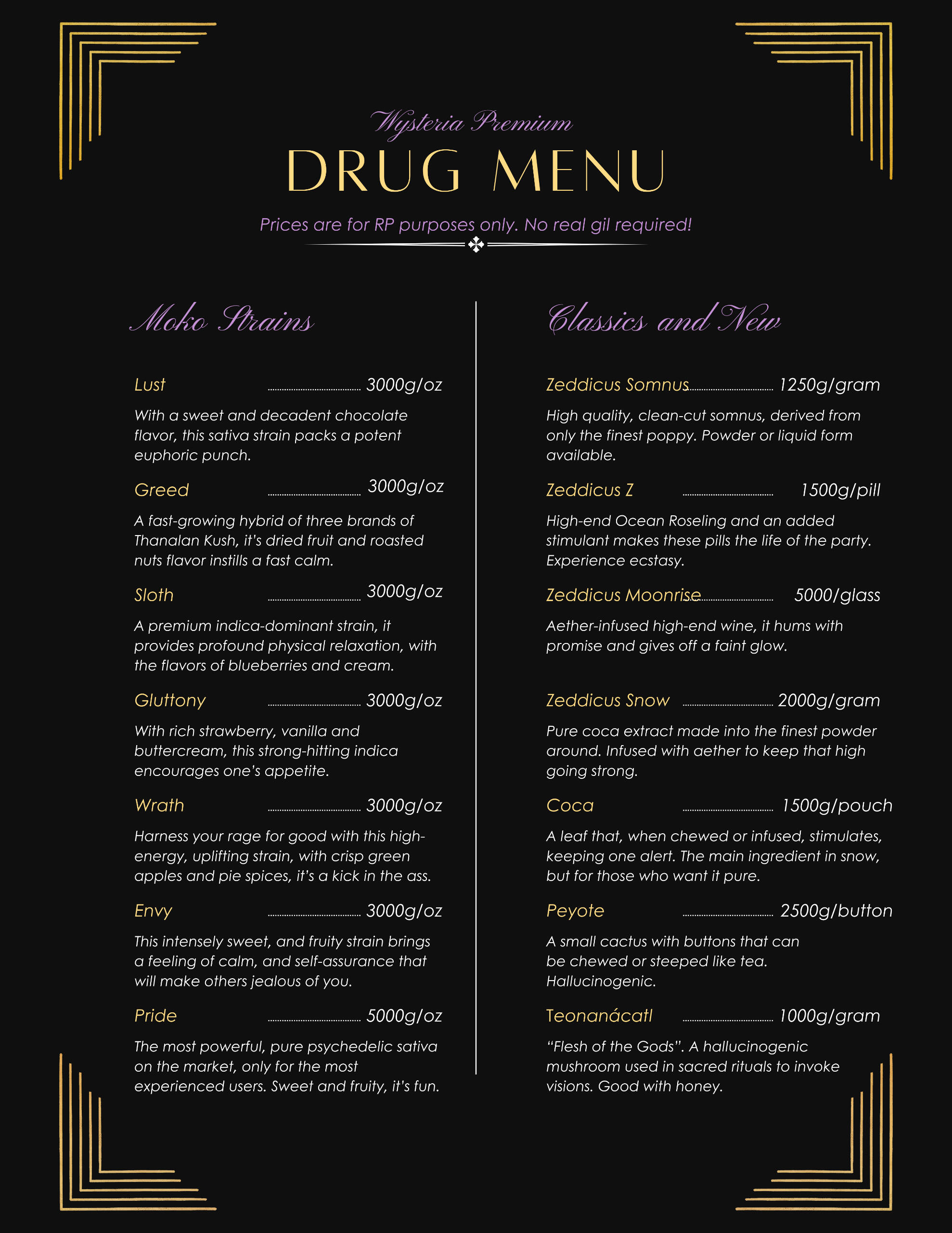 The venue at all times is 21+. This extends to both writers/the characters they play. Club Wysteria is a NSFW environment with criminal undertones and can deal in themes that can be considered sexual, darker and/or potentially triggering to some, and definitely not appropriate for anyone underage.